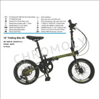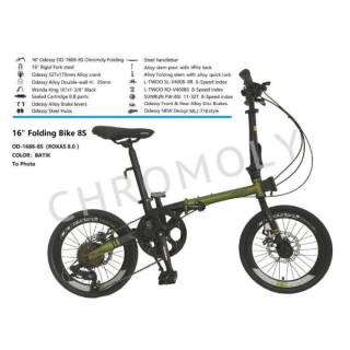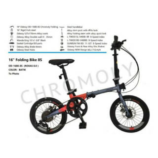 Folding Bike Odessy Roxas 8.0 Chromoly Frame Code = P.OMS SPECIFICATIONS Frame 16" Cromoly Folding Frame Fork 16"Rigid Hi-Ten Steel Fork Shifter L-twoo V-4008 8 Speed Rear Derailleur L-twoo V-4008 8 Speed F/R Brakes Mechanical Discbrake Freewheel 13-32 T Pedal Folding Pedal Crankset Odessy 52T x 170mm alloy crank Bottom Bracket Bearing XR-A01 122mm Chain C 8 Rim Alloy Double Wall 16"3.5 cm Spokes 14 G Tires Wanda 16"x13/8" Saddle odessy Saddle Seatpost Hi-Ten Steel Stem Alloy 6061 with alloy lock Handlebar Hi-Ten Steel W: 600 mm