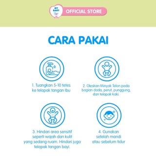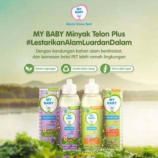 My Baby Telon Plus Oil is telon oil that will keep your little one's body warm. Made from natural ingredients (Eucalyptus, Citronella, and Chamomile) that are comfortable for the baby's body. Soothing scent, Practical packaging, Natural and Halal ingredients. Content: Oleum Cajuputi-Eucalyptus Compositum, Oleum Cocos, Oleum Anisi, Oleum Chamomillae, Oleum Citronellae Benefits: Keeps your little one's body warm, Relieves bloating and colds, Protects from mosquito bites for up to 8 hours. Pros: Soothing aroma, Practical packaging, Natural ingredients, Refreshing, Easy to carry and store. BPOM No.: POM TR152689291