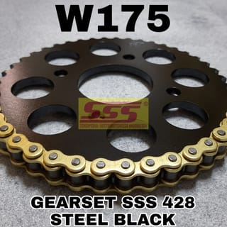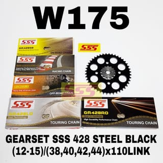 GEARSET SSS 428 STEEL BLACK, SS GOLD SB HSBT HMX CHAIN LO RO O-RING FOR MOTOR: W175 TYPES OF SSS CHAINS BASED ON THE LIFESPAN OF THE GEARSET (NORMAL DAILY WEAR WITH MAINTENANCE): SB: 1.5 - 2 YEARS HSBT: 3 - 4 YEARS HMX: 4 - 5 YEARS LO (ORING): 6 YEARS RO (ORING): 7 YEARS MANUFACTURER'S STANDARD GEAR SIZES: W175: 15/35 ________________________________ STEEL BLACK GEAR SIZE OPTIONS AND SSS CHAINS FRONT GEAR SSS AVAILABLE SIZE : 12-15 SPECIAL BLACK STEEL REAR GEAR OF EVEN SIZE AVAILABLE SIZES : 38, 40, 42, 44 GOLD 428 SSS CHAIN OPTIONS: H (STD), SB, HSB/T , HMX, LO (O-RING), RO (O-RING) COLOR OPTIONS CHAIN 428 HSB/T (Code in the HSB box because T is the code for grease cream, color chain using grease transparent so that the ny code becomes an HSB with the same lifespan and strength: Red, Blue, Green, Purple, Orange, Yellow Please Ask Stock before ordering, thank you.