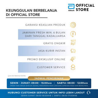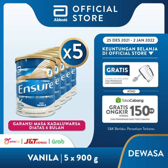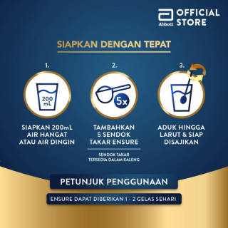 EXP: November 2022 FREE Gift* as long as the supplies are still there. *Prizes do not apply to tokocabang logo orders. ENSURE Adult nutritional milk helps meet your daily nutritional needs. 8 ADVANTAGES OF ENSURE: - Complete Balanced Nutrition Triple Protein: a blend of whey-casein-soy protein. Protein is beneficial for building and repairing body tissues. Source of 14 Vitamins and 9 Minerals, including Vitamin A, Vitamin C, Vitamin E, Zinc and Selenium - Source of Vitamin D & High In Calcium. Calcium helps in the formation and maintaining bone and tooth density. - SOURCE OF FOOD FIBER FOS Omega 3 (Alpha Linolenic Acid) and Omega 6 (Linoleic Acid) - Low Lactose - Good Taste Presentation Advice: Pour 5 tablespoons of ENSURE takar into 200 ml of warm/cold boiled water then stir until dissolved and mixed well. Drink ENSURE regularly 2 glasses a day. ----------- Terms and Conditions: - Limited supplies - Gifts will be sent randomly - Only applies to specially marked products - Does not apply to products of children under 12 months of age - Not applicable to PediaComplete INFORMATION: 1. Please be able to do Video Unboxing (Package Opening), Product Acceptance Photos, Receipt Photos and Buyer Labels when the package has been successfully received so that if there is Damage, Product Deficiency / Gift, or Product Discrepancy received can be validated through such completeness. 2. If there is no or only has one of the necessaryity mentioned, then any form of complaint that comes in cannot be followed up or considered invalid. *unless: there is indeed an error on the seller's side 3. Packaging damage only on the outside (intact inside, no damage / deficiency, etc.) due to poor handling of packages from the Expedition Service. It is expected that the Buyer can make a complaint directly to the Expedition Service Party.
