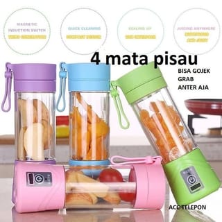 PRODUCT SPECIFICATIONS Ingredient : Food Grade PP Sharp Blade : 304 Stainless Steel Capacity: 380ml Net weight: 392gr Box Size: 8*8*24cm Power Source: USB Cable Motor: DC 3.6V Battery Capacity : 1800MAH 3.7V Battery Charge : 3 Hours for 8 - 10 times Juice (Optimal Crushing even for Ice Cubes) 1. Lightweight and portable, easy to install and easy to clean; 2. The average speed of juice processing is 10 seconds; 3. Best quality borosilicate glass glass for safer and higher temperature protection; 4. When it is charging, it can turn off automatically to prevent overcharging; 5. Simply DOUBLE PRESS THE POWER BUTTON to start the blender 6. Very tight lid, leak-proof; 7. Large capacity battery: 1800mAh Warning: 1. Do not turn on if the blender is empty (Danger). 2. Do not use the blender while charging (As a result, the battery is leaking). 3. Do not press the power button if the blender cup is not connected properly. 4. Do not put any water or liquid on the base, keep it dry at all times (Can Damage the Battery and Engine). 5. Keep away from children when not in use. 6. Do not store in the freezer 7. Don't put hot water in 8. Do not put in the microwave How to Use 1. Connect the cup and base properly. 2. Put the pieces of fruit or vegetables in a bottle and pour milk or water until it is 80% filled from the container. 3. Make sure the cup is tightly closed and then DOUBLE PRESS the power button. 4. If it feels that it is enough, then JUST PRESS the power button once 5. A cup of delicious fresh juice is ready to serve. How to Clean 1. Use a brush and warm water or put the bottle in the dishwasher. 2. Fill the bottle half full with water, press the power button and turn it on for 20 seconds (if there is still any remaining juice around the blade). 3. Do not put/immerse the blender base in water while washing. Charging Instructions 1. Fully charge before initial use.