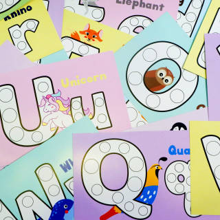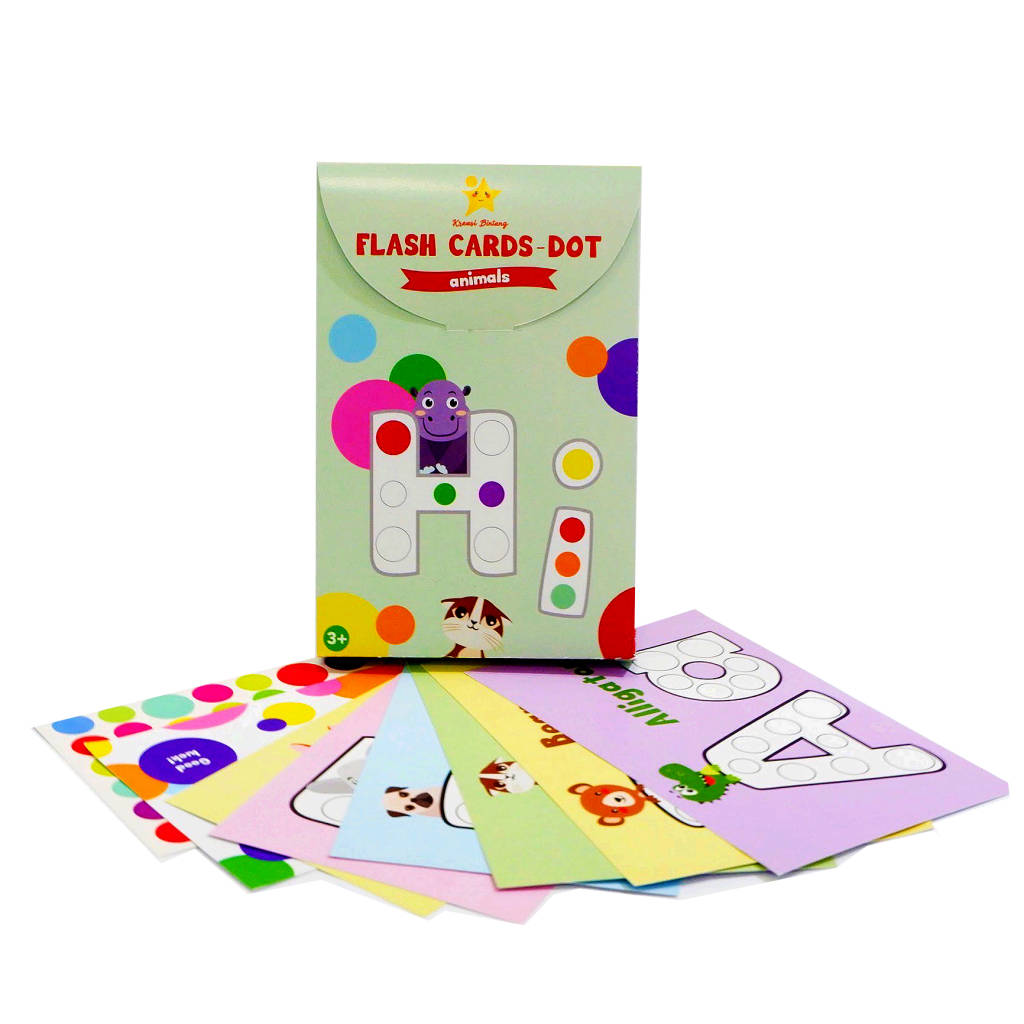 Learning alphabet with Kreasi Bintang Flash Cards - Dot and improve kids fine motors skills with filling the dot activity on the flash cards, this activity are based on Montessori education. Inside the box: • 26 Alphabet Cards • 6 Sheets of colourful sticker dot Age recommendation: 3+