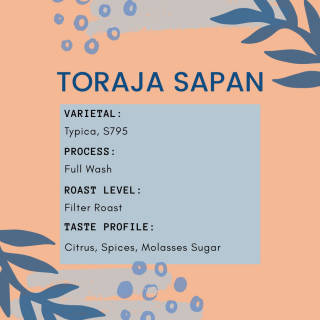 Toraja Sapan Grade 1 Coffee Beans 1 kg nett Roast Level: Filter Roast Profile: Citrus, Spices, Molasses Region: Sulawesi, Toraja Altitude: 1,400 MASL Process: Full Wash Varietal: Typica, S795 Suggested Brewing Method: - French Press - Pour Over - Aero Press - Filter Brewer Packing : Flat-Bottom with Zipper