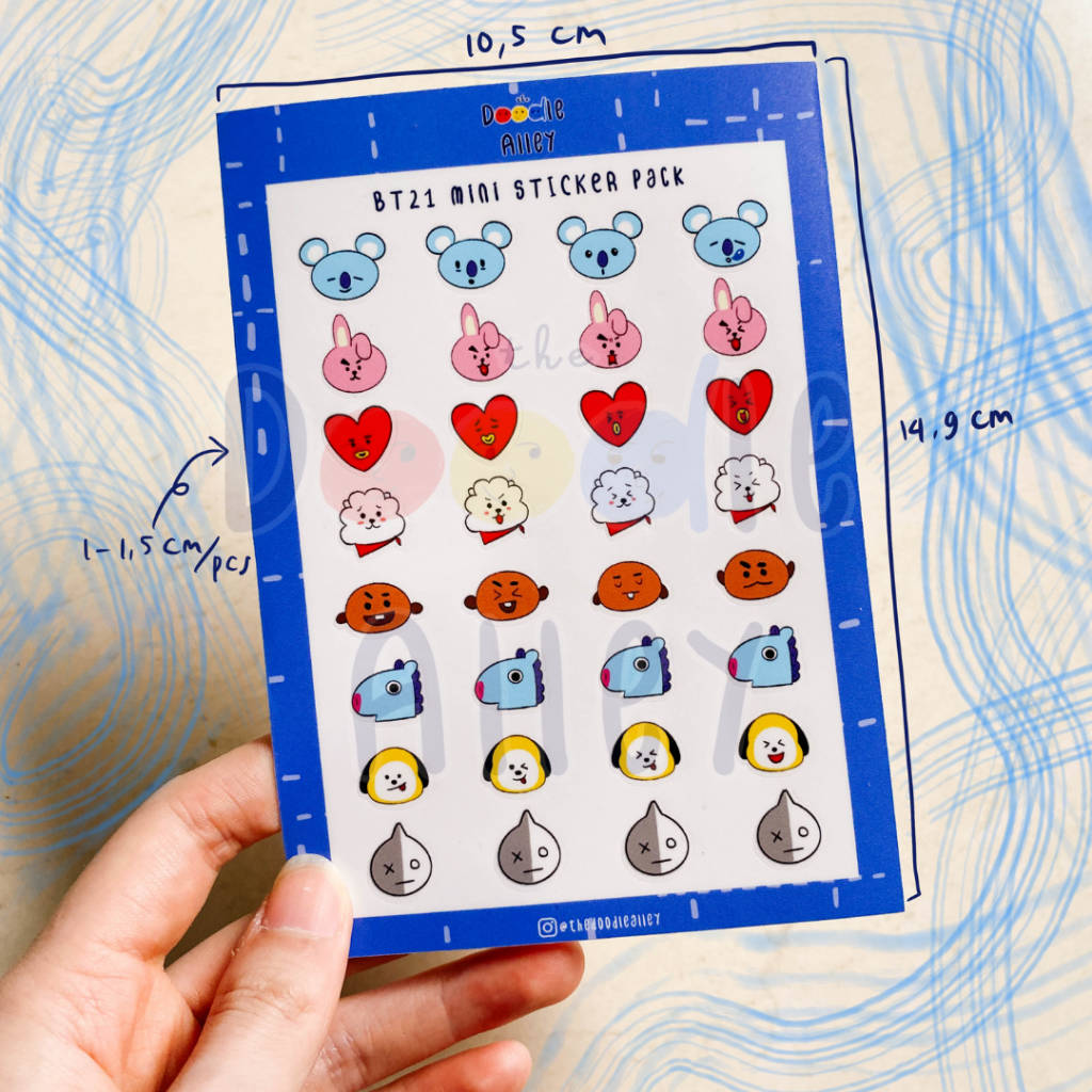 BTS fanmade goods illustrated by The Doodle Alley BT21 version STICKER DETAILS: - Size A6 (105 x 148 mm) - Size each stickies: 1 - 1.5 cm - Material: vinyl and doff-laminated