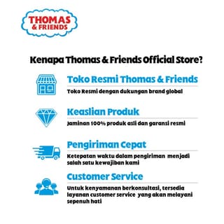 Sodor's incredible adventures await with Thomas & Friends' collection of wheeled locos Thomas & Friends, little mechanics Thomas can enjoy his own train adventures with popular cartoon characters including Ashima, Diesel, Percy, and Nia. Kids can take their friends on a fun ride on each Thomas & Friends track. Combine this locomotive with a range of Thomas & Friends trains of your choice to enhance Sodor's adventure. A collection of metal and wheeled locomotives featuring Thomas and Friends characters. Each is sold separately and depends on availability. The locomotive is compatible with all Thomas & Friends tracks. The locomotive can be connected to trains, vehicles, freight cars, or other Thomas and Friends™ passenger cars via plastic anchor points. Including 1 wheeled locomotive designed to resemble the cartoon character Thomas & Friends. Nb : Track set sold separately and subject to availability 1. Please be able to do Video Unboxing (Package Opening), Product Receipt Photo, Receipt Photo and Buyer's Label when the package has been successfully received so that if there is any Damage, Lack of Product/Gift, or Product Inconsistency received, validation can be carried out through the completeness. 2. If there is no or only one of the mentioned completeness, then any form of complaint that comes in cannot be followed up or is considered invalid. *except: there is indeed a mistake on the part of the Seller 3. Damage to the packaging only on the outside (the inside is intact, the product has no damage/defects, etc.) due to poor handling of the package from the Expedition Service. It is hoped that the Buyer can make a complaint directly to the Expedition Service. 4. Damage to the packaging of the main product cannot be returned if the product is not damaged