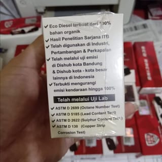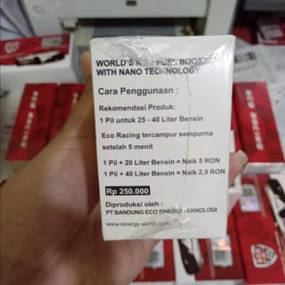 ✔️ Limited Stock ✔️ Authorized Agent of PT. BEST ✔️ Agency ID info Via Chat 📲 ✔️ CAN COD ================================ Adaptive booster that works by increasing RON (research octane number), Increase MON (motor octane number), Improve responsiveness engine torque, with Nano Technology that coats the piston surface, makes your iron horse More responsive and powerful, which will automatically save fuel consumption. As well as making Your vehicle is environmentally friendly, because Eco Racing has been proven to eliminate gas Carbon Monoxide (CO) up to 75% ------------------------------------------------------------------------ Legality: LEMIGAS : Regeistarsi No 050/PK/8.1/1X/2013 PETROLAB: Regeistarsi No 00564/F/13 --------------------------------------------------------- MANFA'AT ECO RACING : 1. Optimize the Combustion Process 2. Prevent Knocking (tickle machine) 3. Improve engine torque response 4. Make the engine pull more powerful 5. Save fuel 30-50% 6. Protect the machine with Nano Technology 7. Extend machine life 8. Removes CO (carbon monoxide) gas 9. Increase RON (reach octane number) 10. Increase MON (motor octane number) --------------------------------------------------------------- How to use: *) Premium: 1 grain mixed 20Liter *) Pertalite: 1 grain mixed with 25 liters *) Pertamax: 1 grain mixed with 30 liters *) Pertamax Turbo: 1 grain mixed with 40 liters *) Less or less is not a problem, the important thing is at least 20 Liters &; maximum 40 Liters of Gasoline * It is highly recommended Mixed Pertalite / Vivo Rev 89, because its effectiveness is more pronounced * The pill will dissolve completely after 5 minutes, and the effect will be felt after a maximum of 4 hours