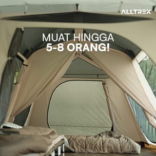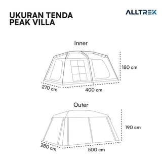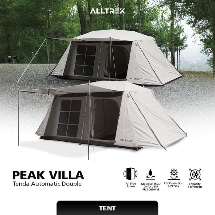 ALLTREK Automatic Tent PEAK VILLA Camping Glamping Luxury Double Layer Automatic PEAK VILLA is perfect for those of you who want to look different from the rest! PEAK VILLA has a size of 5x2.8x1.9 meters with 150D Silver-coated Oxford outer material with PU 2000-3000MM, 190T Polyester + High Density Mesh inner material, and 150D Oxford flooring material with PU 2000-3000MM, so it can withstand even heavy rainwater! PEAK VILLA has a capacity of 5-8 people so it is suitable for your small family! With wide windows and a large mesh roof, it can make the air circulation in the tent better and not make it hot! PEAK VILLA has 4 doors on all sides, even the side doors can be opened and connected to the car trunk door, so it is suitable for you camper vans! PRODUCT SPECIFICATIONS Code : PEAK VILLA Brand : ALLTREK Material -Outer: 150D Silver-coated Oxford Cloth PU 2000-3000MM -Inner: 190T Polyester + High Density Mesh -Flooring : 150D Oxford Cloth PU 2000-3000mm - Frame: Allumunium Size -Outer : 500x280x190 cm -Inner : 400x270x180 cm -Folded/Storage : ±115x27x27 cm *Measurements are done manually. Size tolerance ±5 cm Weight: 17Kg Capacity : 5-8 people Completeness: - Bag x1 - Inner x1 - Outer x1 - Awning Pole x2 - Stake x24 - Windrope x10 #ALLTREK #MakeCampingExperiencesBetter #Glamping #Camping #TendaOtomatis #TendaCamping #TendaGlamping