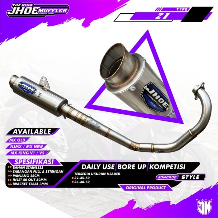 Welcome to Jhoe Part Shop Exhaust Racing MX OLD MX NEW MX KING Roadrace TYPE Z1 By Jhoe Muffler Original EQUIPMENT : HEADER / NECK SILENCER 3PCS PIR STICKER PACK JHOEPART JHOEPART T-Shirt (for non COD purchase) JHOEPART KEYCHAIN Specifications: TYPE Z1 Stainless Material Stainless Front neck roll THICK anti-fracture Roadrace Style Model Mandatory underbond Full & Half Nests ( Write Ordered Order ) Solid Bass sound Header sizes 32-35-50 (Under 200cc) & 35-38-50 (200-250cc) Tube Length 25cm FREE LASER NAME for non COD purchase ( write in order description) ---------------------------------------------------------- FREE T-SHIRTS BY JHOE MUFFLER (NOT FOR COD PAYMENT) > For the size of the t-shirt, please include it in the order description. REGULATION. 1. MANDATORY ACTIVE WA NUMBER 2. The address must be clear and VALID 3. MANDATORY VIDEO UNBOXING YOU BUY=AGREE Advantages of Shopping here : - Quick response - Fast service - Precise delivery - 100% Real Pict **RETURN AND WARRANTY TERMS AND CONDITIONS: 1. MUST SEND PROOF OF UNBOXING VIDEO (from the first time opening the package) 2. Warranty Not Valid If You Order Wrong 3. The warranty does not apply if the goods are damaged/lost during delivery, as this is the responsibility of the courier/expedition