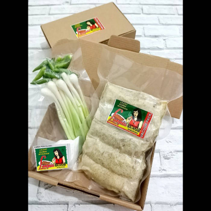 COMPLETE WITH LEEKS Lunpia (Value pack) *only for self-frying* Choose shipping with an estimated arrival of 2 max 3 days. **Outside the island of Java, it is recommended to choose LION PARCEL shipping *The size of the Lunpia Value Pack is SMALLER than our Regular Lunpia. For size comparison: - Regular Lunpia (d: 3.5-4 cm; length 13.5-14 cm) - Lunpia Value Pack (d: 2.5-3 cm; length 9.5-10 cm) **Measured when lunpia is not in a vacuum** At room temperature max hold. 5 days (The temperature in the expedition shipment is hotter than the room temperature, SHG accelerates the life of the product) Price for 1 pack contains: - 5 Wet lunpia - green onions + cayenne - seasoning powder (along with how to serve it to make the sauce) Packing is guaranteed to be safe and very suitable as a souvenir for relatives/friends. 100% HALAL Lunpia filling: bamboo shoots, shrimp, and eggs