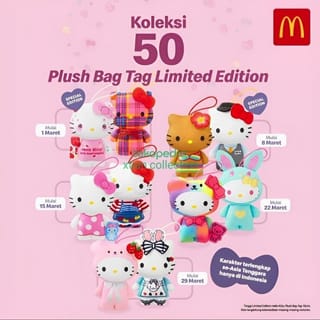 Sales Hello Kitty 50th Anniversary Limited Edition Hello Kitty Plush Bag McDonald's Indonesia PERIOD 1 1. HK 50 th Anniversary 2. Ballerina 3. Mermaid 4. Country 5. McD's Uniform 1 6. Tennis 7. Monotone 8. Rainbow Fairy 9. Tartan Checker 10.Kimono Height 10 cm New Condition/Seal Conform as figure 3,4,5 Complete with box & plastic seal IF THE AD IS STILL RUNNING, IT MEANS THAT THE PRODUCT IS STILL THERE/READY!