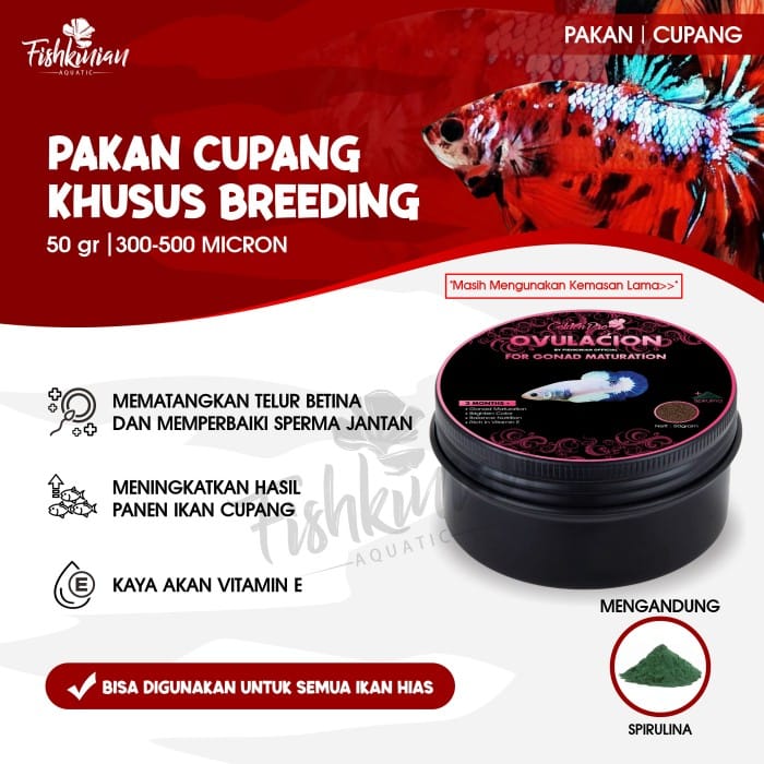OVULAION by Golden Pro Indonesia (BEST SELLER) Weight 50 grams Ovulaion is a feed that is specially formulated for betta fish to be mated. Ovulaion can be used on both female and male betta Ovulacion is a betta fish pellet made from PREMIUM pellets with high nutritional content: Protein 53.1%, Fat 4.1%, Water 4.3%, Minerals 6.3%, Carbohydrates 22.3%, Fiber 9.78%, Vitamin B12 1.380% and Vitamin D 0.80% . ADVANTAGES : - Maturing female betta fish eggs - Improve sperm quality of male betta fish - Complete nutrition - Rich in Vitamins - Fish is healthier than using natural feed because pellets are cleaner and sterile. Note: Still using the old packaging Increase breed yields by using Breed Pro, an abundant male foam https://www.tokopedia.com/fishkinian-official/obat-breeding-kawin-ternak-ikan-cupang-breed-pro-fishkinian Make the fish comfortable when mating with Ketapang Daun Directly Melting https://www.tokopedia.com/fishkinian-official/ketapang-laut-olahan-fermentasi-50-gr Prepare natural burayak feed with high-quality Artemia https://www.tokopedia.com/fishkinian-official/artemia-brineshrimp-pakan-alami-burayak-ikan-cupang-betta?extParam=whid%3D1849610 WARRANTY 1. Make sure you have an unboxing video without a pause and show the product in a damaged or non-functional state 2. Immediately contact us if our products are under-delivered/misdelivered/mistyped/fish in a sick/dead state and other obstacles 3. Immediately unbox the packages that have been received, especially the packages containing ornamental fish/shrimp and don't forget to acclimatize the fish/ornamental shrimp SHIPPING 1. Fishkinian delivery is done every day, except Sunday. 2. Orders under 15.00 WIB will be sent the same day. 3. Saturday orders after 13.00 WIB will be sent the next day (pick-up courier at 14.00 WIB)