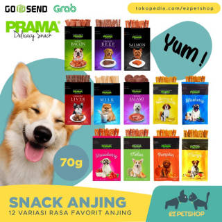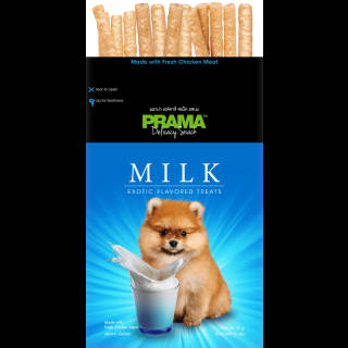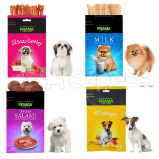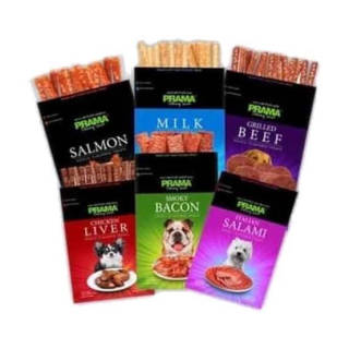 PRAMA Collection Dog Snack Weight: 70gr Is a snack that has a taste that dogs really like. Made from quality chicken meat that is safe and harmless if given to your dog. Snacks can be given to dogs as a snack to prevent boredom in the dog's daily diet. Made in Thailand Available flavors according to variants. Information: - Store in a cool and dry place, - ONLY FOR PETS - Suitable for all types of dogs - Once opened, consume within 7 days Feeding instructions: Feed as a snack or gift for dogs, age over 3 months, Dog Weight: - 1-5 kg: 1-2 pcs/day - 5-10 kg: 2-3 pcs/day - 10-20 kg: 3-5 pcs/day - More than 20 kg: 5-7 pcs/day Exp : milk 25-07-2023 banana 27-07-2023 strawberry 28-07-2023 salmon 18-12-2023 Pate 17-09-2023 bacon 18-12-2023 blueberry 28-07-2023 pumpkin 29-07-2023