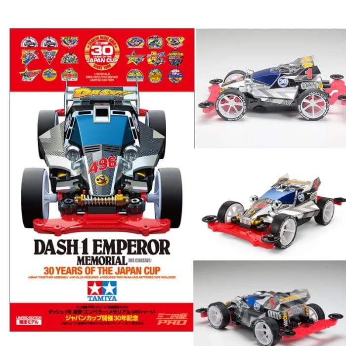 TAMIYA 95110 DASH 1 EMPEROR MEMORIAL 30 YEARS OF THE JAPAN CUP - Japan Cup holding Memorial model commemorating 30 years - The 1st Japan Cup was held in 1988, and in 2018 it is the Memorial Year which celebrates 30 years. - The machine adopted the [Emperor] which was also used for the 1st and 2nd emblem, the chassis is strongly popular MS type. - Set a special design metallic style sticker that fits body color. - The MS chassis is a special color made of ABS plastic with nose tail unit red and center unit black. - Suspension set the Super Hard Large Heavyweight Tire with white print lettering for a racy look on six spoke whee - Metallic stickers are included to create body markings, logos and carbon fiber pattern sections. INCLD DYNAMO LIMITED ITEM LIMITED QUANTITY AS LONG AS IT IS STILL IN THE STOREFRONT, THERE IS MSH STOCK. BUY=AGREE NO COMPLAIN AND RETURN