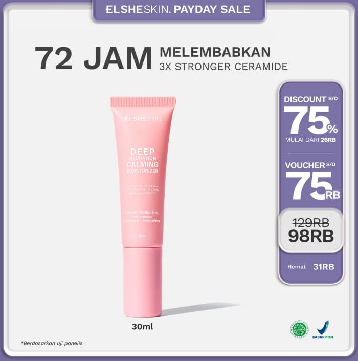 Deep Hydrating Calming Moisturizer For Intense Hydration Benefit: -Hydrate, Soothing and Moisturize -Prevent TEWL ( Transepidermal water loss) up to 13.5% -Gives and locks moisture for 72 hours -Reduce and treat sensitive skin (itching, redness, peeling, irritation, etc.) -Protect, repair and strengthen barrier skins -Make skin healthy, glowing, supple and smooth -Can be used for eczema, dermatitis and rosacea Womb AquaxylTM Boost 13.5% hydration level Ceramide For stronger skin barrier Calendula Flower Calms skin Royal Jelly Blocks irritation Triple Cica Smoothens texture Saccharide Isomerate For long lasting hydration Niacinamide Brightens skin Peptide Firms skin Zinc Gluconate Reduces redness Korean Herb Purslane Repairs skin cells HALAL, BPOM, EWG Certified Alcohol-Free Paraben-Free Fragrance-Free SLS-free Safe for pregnant and lactating women Sensitive skin friendly BPOM NO: NA18210104677 For those of you who are interested in becoming an ElsheSkin reseller, you can directly contact us via Whatsapp 0813 9326 5634 Procedure for claiming damage/shortage of goods: 1. Show proof that the goods received are not suitable / damaged by attaching unboxing videos &; photos when the goods are received. 2. Without videos and photos, the claim is considered INVALID, and the buyer cannot return the goods. 3. SHIPPING COST of goods to be returned is the responsibility of the BUYER. 4. If 2x24 hours video is not provided, then damage or lack of goods is not our responsibility. 5. We consider the buyer to agree to the provisions of points 1-4 when transacting in our store.