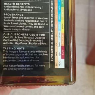 Our organic Jarrah honey is collected from the lush Jarrah forest, just southwest of Perth near the town of Lesley, Western Australia.Flowering only every two years, the cream-coloured Jarrah blossom produces a dark yellow honey that is rich in lower glucose levels than other honey varieties, with a deep and complex flavour. Like all of our honey products, our Jarrah Honey has a very high Total Activity rating, making it not only rich in flavor but also antimicrobial qualities. WHAT IS TOTAL ACTIVITY? Total Activity is a measurement of the anti-microbial quality of honey, the anti-microbial power in killing bacteria. Any honey with a TA rating higher than 10+ has beneficial antimicrobial properties. The greater the TA number, the stronger the level of honey's antimicrobial effects. Total Activity TA 10+ 20+ 30+ 40+ 50+ Manuka MGO 250+ 800+ 1000+ 1250+ 1500+ Strength Rating Mild Strong Very Strong Extreme Super