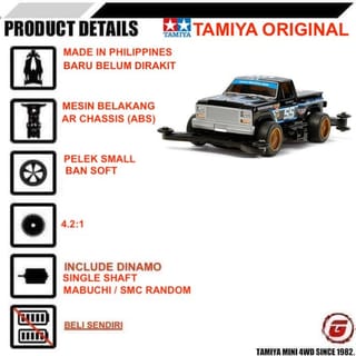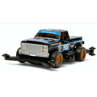 TAMIYA 95298 TRUCKIN JOLLY JOKER PREMIUM (RE-RELEASE) Jolly Nice to Meet You Again... This is a premium version of the Jolly-Joker, a model which first appeared in the Truckin' Mini 4WD Series back in 1990. It cuts a cool figure with its lowered-down truck body finished in black with smoke-colored tinted windows. The car's markings and number are depicted using stickers included in the kit. It is based on the AR chassis, which includes screw-attached side catch mounts to enable the attachment of the Jolly-Joker body. The motor and batteries can be attached and detached without removing the body from the chassis. Different-width front and rear small diameter wheels have wire-type spokes finished in gold and are mounted on slick tires. AR Chassis The AR chassis is designed to offer its driver durability, customizability and ease of maintenance, all of which are key ingredients for a successful Mini 4WD racer. Its aerodynamic form smoothly allows air to pass through the chassis interior as the machine runs, performing the vital function of cooling the batteries and motor and extending their effectiveness. This high-speed racing chassis also features low-friction plastic bearings to ensure that any loss of power from the engine to the wheels is minimal in nature. The under panel and diffuser can be removed from the model without taking off the body, while a low-friction rear skid bar is fitted to slash time loss experienced on tricky slope sections, and keep the racer on the track where it belongs. Features a 4.2:1 gear ratio.