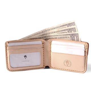 The latest generation of KARIMATA. Our flagship short-size leather wallet made of the best vegetable tanned cowhide with Indonesian origin. Some of the new features are the larger open card slot area that can be used to store photos. Material Description: Finest Grade Indonesian Natural Vegetable Tanned Cowhide Natural artificial sinew thread Hand-stitched construction Burnished edge Design: Bi-fold shorts Six (6) card slots with V-Cut signature slope One (1) open-slotted card compartment on the interior VOYEJ concho debossed on the interior Concave accent on the exterior Dimension: 3.2" Width x 4.5" Length x 13 mm thickness when folded