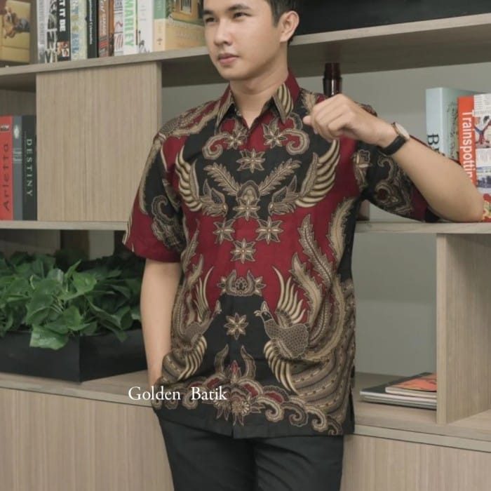 Modern Men's Batik Shirt Short Sleeve Cotton Stone Raden Coated Furing - maroon, S