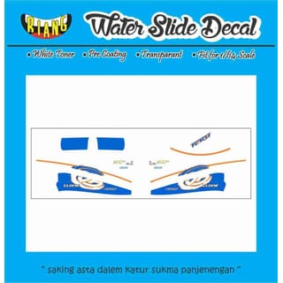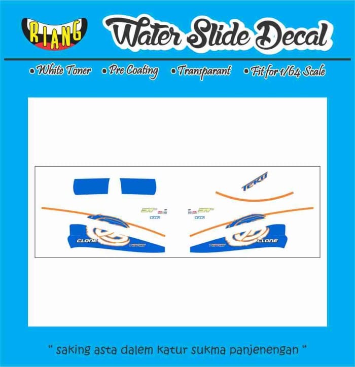 Decal Waterslide - Pre coating - Mirror apply - Fit for 1:64 Scale How to install WT decal 1. Cut the decal that we are going to wear. 2. Clear using gloosy spray paint, no need to be thick, the important thing is flat, any brand is allowed, recommendations to use the Pilox brand. 3. After clearing, let it dry, do not dry under the sun. 4. After drying, cut according to the shape of the picture. 5. Put in water +- 20sec 6. Wet the surface to be decalized. 7. Lift the decal along with the paper, put it on the body that we will install, slowly slide the top, after sliding the paper, arrange it as we want. 8. After suiting, use a tissue or cotton bud, until it runs out, after which wipe the remaining water using tissue until it is completely dry. 9. Clear body uses clear glossy/doff as needed. More info chat personally.