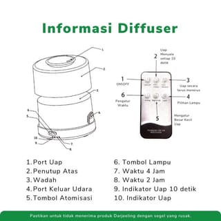 Product Details: Diffuser Capacity: 500ml Power Consumption: 12W Steam Output: About 50-70ml/h Ultrasonic Rate: 2.4MHZ Timing: 1H, 2H, 3H/ON Max time of continuous use: 4 hours LED: 7pcs (Blue, Red, Green, White, Yellow, Purple) Steam Adjustment: Yes Material: PP, ABS. This diffuser gently disperses essential oils into the air using ultrasonic technology. Without the use of heat or chemicals, this diffuser helps maintain the natural profile and therapeutic benefits of Darjeeling essential oils. If the diffuser runs out of water, the device will automatically shut down. This diffuser features 7 colors of LED lights that can be set to light up all colors or set to your favorite colors How to Operate: 1. Remove the top cover. 2. Add 200 - 300ml of water to the Water Reservoir. 3. Add 10-15 drops of essential oil directly to the water. 4. Replace the top cover. 5. Connect the device to power by plugging the adapter into the power socket. 6. Press the Power Mist/Light Button on the diffuser to start the device. 7. The function can be set by pressing the corresponding button. Steam Button Operation: 1. Press the Mist Button once to turn on the device for 10-second intervals, be on for 10 seconds and turn off for 10 seconds 2. Press the second time Mist Button for the 2-hour timer mode. 3. Press the Mist Button for the third time during 4 hours of clock mode. 4. Press the Mist button for the fourth time for continuous mode. 5. Press the Mist Button for the fifth time to turn off the device. For more information about this product please contact us. Happy shopping!
