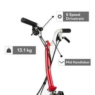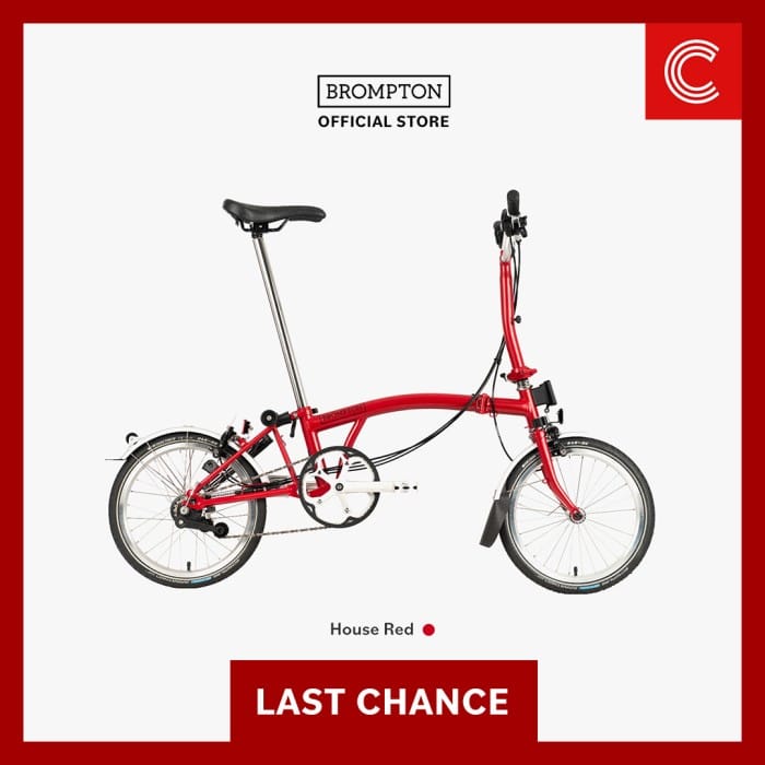 Brompton C Line Silver Component Explore Mid Handlebar - House Red Free Brompton Metro Pouch Black Classic All-Steel Folding Bike. An all-rounder with 6 speeds is ready to go further. Covers all contours, around the house or further afield. SPECIFICATIONS: Folded Size: 645mm (H) x 565mm (W) x 270mm (D) Main Frame: Precision drawn heat-treated steel tubing with hand brazing and selected auto-brazed joints Rear Frame: Hand brazed cold-formed micro-alloy steel tubing Fork: Steel brazed fork Handlebar (mid): Brompton triple butted 6061 aluminum handlebar with shot-peened finish. Seatpost: Brompton Extended Chromoly steel tube. Suitable for maximum inside leg 35 #34;/89cm Saddle: Standard Saddle Seat clamp: Composite seat clamp and rear frame clip Drivetrain: Brompton Wide-range 6 speed drivetrain (2 x 3 speed), 300% range Chainset: 6061 forged aluminum crank with 50T chainring and integrated chainguard Bottom Bracket: Square taper bottom bracket Chain Pusher: Brompton Chain Pusher Shifter: Brompton 2 and 3 speed Trigger shifters Front Wheel: Double wall rim, 28 spokes, Brompton front hub Rear Wheel: Double wall rim, 28 spokes, Brompton Wide ratio 3 speed internal gear hub with 2 speed external gears (13 and 16 tooth) Tires: 349 x 35C Schwalbe Marathon Racer. A puncture resistant tyre with a reflective sidewall Tubes: Schrader valve Mudguards: Mudguards with rubberised flap Brakes: Brompton Dual Pivot Calipers Hinge Clamps: Composite hinge clamp levers Lighting Front and rear reflectors Front carrier: Front carrier block adaptor for all types of Brompton luggage Pump: Brompton pump with flexible hose compatible with Schrader and Presta Valves
