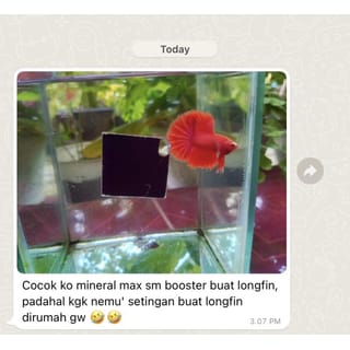 High quality minerals containing magnesium, calcium, and other supporting minerals that are specially formulated to spur the growth and development of betta fish, channa, guppy, chef, and other ornamental fish. Advantages: - Selected materials - Does not change the color of the water - Does not make the water cloudy / buoyant Function: - Regulating Water and Fish Balance - Strengthens Fish Bones and Fins - Overcoming Gill Problems - Prevents parasite/fungal attacks RULES FOR USING WHEN CHANGING NEW WATER 1-2 drops/liter of water 4-6 drops/liter of water (Recommended bgt guys) (Simply multiply the volume of water used) Example: Mineral Max + Betta Booster Mineral Max + Catappa Liquid Mineral Max + Betta Booster + Catappa Liquid NO NEED TO USE FISH SALT ANYMORE BECAUSE MINERAL MAX ALREADY COVERS ALL THE MINERAL NEEDS OF FISH! Packaging 100ml Contents 110ml