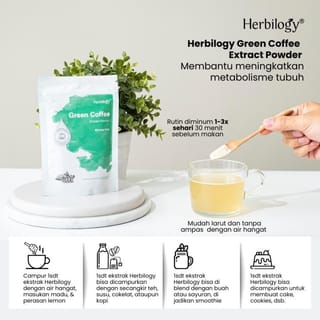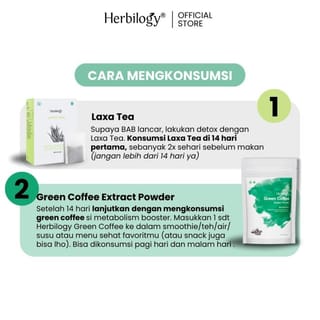 Contents of 1 Pack of Herbilogy Healthy Slimming Combo: -2 pcs Herbilogy Green Coffee Extract Powder (100gr) -1 pack of Herbilogy Laxa Tea (contains 20 teabags) -1 Booklet of instructions for use Benefits: - Herbilogy Green Coffee Extract Powder: Helps prevent fat accumulation and improves the body's metabolism. - Laxa Tea Herbilogy: To promote bowel movements and help burn fat in the body. This product has been BPOM/PIRT; Halal MUI Certificate: Herbilogy Green Coffee Extract Powder: P-IRT 5103515430746-22 Herbilogy Laxa Tea: POM•TR. 102 210 261 How to use: - Herbilogy Green Coffee Extract Powder: Dissolve 1 tsp of Herbilogy Green Coffee Extract Powder into a glass of warm water/mix it into a smoothie/juice/oat pulp. - Herbilogy Laxa Tea: Put the tea bag in a cup, pour boiling water and wait 2-3 minutes. Drink 1-2 times a day after meals. 1 tea bag can be for 2 brews. Please see the picture in the carousel for how to use this pack. Caution: Side effects: Frequent urination, smoother bowel movements, or sweating easily. Drink water min. 2.5 L per day to avoid dehydration. Caution Not for use by children, PREGNANT WOMEN AND BREASTFEEDING MOTHERS Close the packaging tightly, always use a new and clean spoon.
