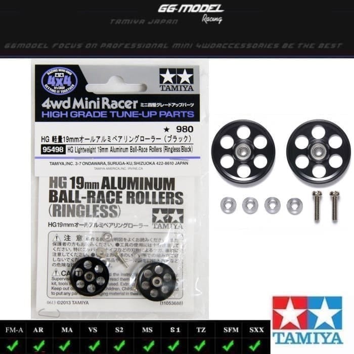 TAMIYA 95498 HG LIGHTWEIGHT 19MM ALUMINUM ROLLERS (RINGLESS/BLACK) - Weight reduction of 19 mm diameter all aluminum bearing roller which is popular among rollers. - By changing the hole and shape of 6 places, we realized about 30% lighter weight in the aluminum part. - Smooth rotation with 520 ball bearings embedded in the roller body is also attractive. - In addition to 2 rollers, 2 mounting screws and 4 aluminum spacers were also set. [Basic Spec] - 2 all aluminum rollers with a diameter of 19 mm TAMIYA TAMIYA ORIGINAL #TAMIYA #ROLLER