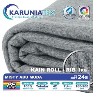 Specification of Material of Plain T-Shirts, Screen Printing T-Shirts, Pants, PE Soft Instant Hijab: Yarn : PE Soft 24s Material : 100% Polyester Type : Single Knit Grammage : 180-200 gsm Length : 2.40 m / kg Width : 42 inches / 1.05 m Type : Tubular (Sheath) Handfeel : Super Soft -------------------- Fabric 0.5 kg - Items listed are per 0.5 Kg - Items excluding ribs (fabric only) - Weight tolerance of 0.05 Kg -------------------- 1 Kg Fabric - The goods listed are per 1 Kg - Items excluding ribs (fabric only) - Weight tolerance of 0.05 Kg -------------------- Rib 0.5 kg - Items listed are per 0.5 Kg - Items excluding fabric (ribs only) - Weight tolerance of 0.05 Kg -------------------- Rib 1 kg - The goods listed are per 1 Kg - Items excluding fabric (ribs only) - Weight tolerance of 0.05 Kg -------------------- Fabric + Rib - The items listed are 1 Kg Cloth & 0.04 Kg Rib - Items include cloth & ribs - Weight tolerance of kilos (0.05 Kg) -------------------- Roll Fabric - The goods listed are 25 Kg Fabric - Items excluding ribs (fabric only) - Weight tolerance of kilos (0.5 Kg) -------------------- Roll + Rib Fabric - The items listed are 25 Kg Fabric + 1 Kg Rib - Items include cloth & ribs - Weight tolerance of kilos (0.5 Kg) -------------------- Happy Shopping Thank you