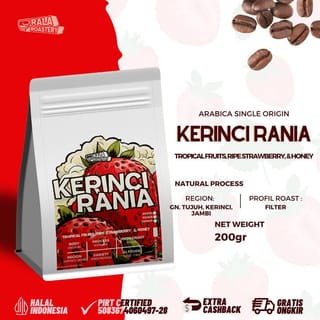 Dear Friend Rala, | Kerinci Arabica Unit 200gr | NO. HALAL CERTIFICATE : ID73110001642710223 P-IRT NO. 5083674060497-28 | Coffee Details Region : Bengkolan Village, Mt. Tujuh, Kerinci, Jambi Producer : Abdul Aziz Thohari Variety : Sigararutang, S Line Harvest : Natural Altitude : 1400 - 1700 masl Profile Roast Filter | Taste Notes : Tropical fruits, Ripe Strawberry, & Honey | Packaging Coffee : One way Valve, Aluminum Foil, Zipper | Variants COFFEE BEANS/BEANS : Stored longer or want to be ground yourself COARSE GRIND : French Press, Cupping, Cold Drip, Chemex MEDIUM/MEDIUM GRIND : Vietnam Drip, Pour Over (Kalita, V60, etc) FINE/FINE GRIND : Espresso, Mocha Pot, Manual Espresso, Tubruk Regards, Rala Coffee & Roastery