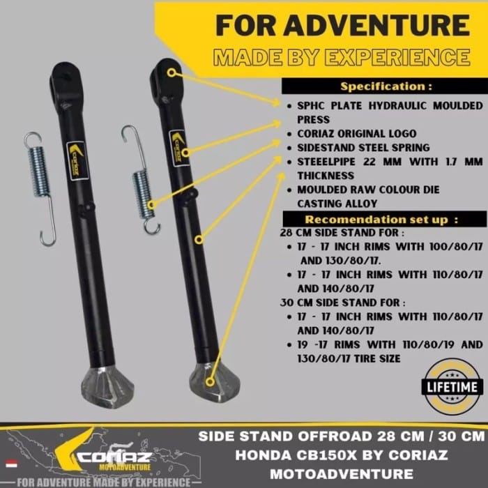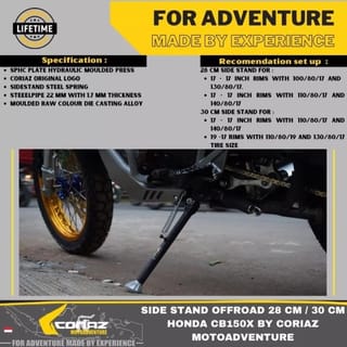 The standard side Coriaz Motoadventure Special CB150X and CB150R 2021 up other bikes likely could. This side standard is designed for the CB150X where the original standard is only 23 cm long, making the parked motorcycle very inclined. Available in 2 models: 28 CM and 30 CM. The description can be seen in the second slide photo,,, Coriaz as a specialist adventure accessories manufacturer always prioritizes function and strength as well as a neat appearance. With a wide tread on the standard base, it allows riders to park their motorcycle on the ground or sand without fear of falling Lifetime warranty for the first buyer according to the name of the orderer here and valid if it gives 5 stars and positive reviews on the purchase of goods from us. And the Coriaz brand stickers are still neatly affixed.