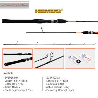 SIZE 562 (LENGTH 165 cm) Actwion : Medium Heavy 7-17lb Guide: FUJI Concept (7pcs) Packing delivery : PVC package The new Hemus Zenvo Series. Superior sensitivity and precise action, this series made of 36-ton Graphite also has Carbon fiber reinforced WXW wrapping, which provides the strength and backbone needed at the time of Strike with big fish. Premium Fuji Concept Type LY guide rings are 5% lighter covering each rod, also optimizing every rod action, while providing long-lasting durability and enhanced casting. The new, exclusive Reel Seat offers increased sensitivity and comfort as well, and the full grip EVA handles the balance in each bar perfectly. Built for superior and lightweight application fishing proficiency, this rod delivers optimal angler performance