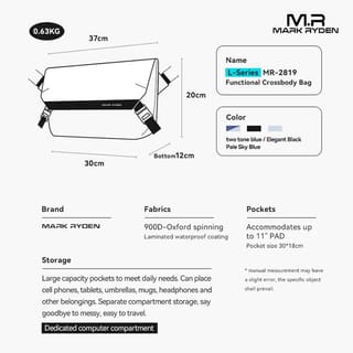 Type: MR2819 Color : Black Specifications: Main Material : Oxford Dimensions: 37 x 20 x 12 CM Weight : 630grams Fits: 11 inch tablet (30 x 18cm) Features: - Water Repellent - Magnetic buckle - Main pocket - Front zipper pocket - Back pocket - Luggage strap - Adjustable strap - YKK Zipper Package : 1 Unit Mark Ryden MR2819