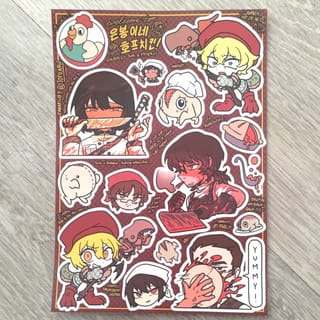 MUST READ **** Minimum purchase of Rp15.000 (can mix other stickers) Purchases of less than IDR 15,000 will be cancelled ——— Minimum purchase is Rp15.000,- (can be mixed with other stickers) Order less than Rp15.000,- will be cancelled END **** Limbus Company Project Moon Fanart Sticker By Tofuaru Details: - Kisscut sticker - Waterproof - Size 10.4 × 14.8cm Includes: R.B. Chef de Cuisine Pierre Ryoshu Lifetime Stew Sinclair R. B. Sous Chef Jack Gregor Lifetime Stew Don Quixote Meursault surprise taste tester (yummy) Heathcliff's hand (does that count?) Outis... as her usual herself A Lot of Bongy Bongy Plush Eunbong Logo Thanks for visiting this page. Have a P.I.E.! (Pantastic Interesting Everyday) (I'm sorry)