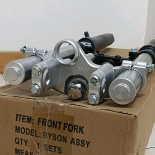 BYSON FRONT SHOCK BRAND MGV TO BE INSTALLED IN BYSON OR MAKE MODIFICATIONS TO OTHER MOTORS ESPECIALLY FOR INSTALLATION MODIFICATIONS FOR ANY MOTORCYCLE OF ANY BRAND AND TYPE, IT IS NECESSARY TO TURN THE TRIANGLE AXLE AND CHANGE THE FRONT DISC BRACKET EXCEPT FOR THE BYSON MOTORCYCLE, THE INSTALLATION CAN FIT WITHOUT ANY CHANGE This shock makes the appearance of the motorcycle in the leg sector look more robust Suitable for custom bike modification, street fighter, japs style etc Shock material is light and strong, good quality not easy to rust
