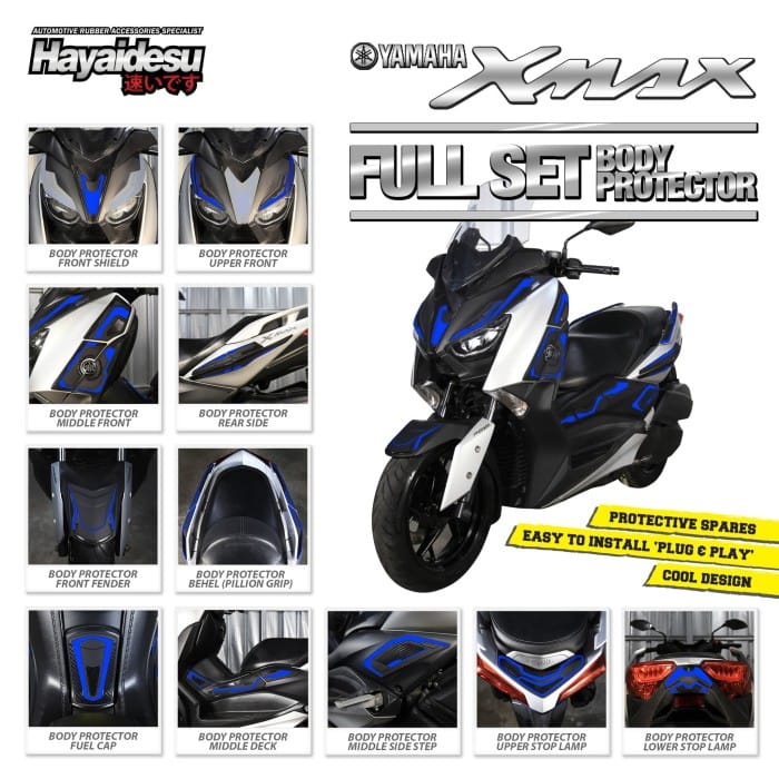 *IMPORTANT: WE DO NOT SELL MOTORCYCLES OR MOTORCYCLE BODIES. WHAT WE SELL IS A BODY PROTECTOR OR MOTORCYCLE BODY PROTECTOR MADE OF RUBBER, THE USE OF WHICH IS TO ATTACH IT TO THE MOTORCYCLE BODY LIKE A STICKER. THE MOTORS IN THE PRODUCT PHOTOS ARE FOR VISUAL PREVIEW PURPOSES ONLY. PLEASE READ THE DESCRIPTION CAREFULLY BEFORE PLACING AN ORDER STOCK READY TO GO! NO NEED TO ASK ANYMORE IMMEDIATELY BRUSH ! Hayaidesu Body Protector Xmax, This body protector is made of Premium quality rubber material specifically designed for your Xmax motorcycle with the function to protect your Xmax from abrasions due to impact. while improving the appearance of your Xmax motorcycle to be more stylish amp; sporty with a doff color design and a luxurious carbon motif look. Specifications: Item: - Front Fender Cover - Front Shield Cover - Fuel Cap Cover - Upper Front Cover - Middle Front Cover - Middel Deck Cover - Middle Side Step Cover - Rear Side Cover - Braces Cover - Upper Stop Lamp Cover - Lower Stop Lamp Cover Material: Flexible Rubber Quality: Premium Quality Rubber Others: Includes Automotive Tape Durable High Technology Precision Sporty amp; Premium Class Available Colors: Black-blue (Black-Blue) Black-yellow (Black-Yellow) Black-red (Black-Red) Black-grey (Black-Gray) All Black (Black-Black) FREE MUD FLAP PER PURCHASE 1 SET OF BODY PROTECTOR