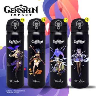 YOU CAN REQUEST ANY GENSHIN IMPACT CHARACTER. CAN BE CUSTOM NAME YOU CAN CHOOSE THE COLOR OF THE BOTTLE. FREE ANYWAY This hot water thermos is made of stainless steel material with 304 material. Where it is really very difficult to rust. The bottle cap in the perfect design makes it very easy for the owners to be able to drink directly from this thermos without having to turn the cap. Just with the touch of one finger it will immediately open and drink immediately. Guaranteed a super tight lid will not make this Thermos leak (If it is closed tightly) when placed in a sleeping position. This thermos has a Lock system so that it is not easy to open if we are pressed on the opening. This thermos has interesting color variants such as: - White - Pink - Black - Gold - Red - Tosca Green Please write the color request and color alternate in the "note for seller" at checkout. We try to make the requested colors according to ^^ expectations Stainless Steel Material Capacity 500 ml Height 22.5cm Diameter 6.5cm
