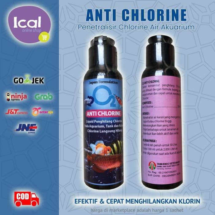 O2 Anti Chlorine is a Chlorine removal concentrate liquid made with a Japanese formula. This product is very safe and fast to neutralize Chlorine. Composition : Anti Chlorine ........... 100% === SAFE FOR FISH amp; AQUATIC PLANTS === Indications : - Neutralizes tap water that contains high chlorine or chlorine - Calms stressed fish - Not harmful to aquatic plants - Makes fish more active and healthy Rules of Use : 1 full teaspoon for 50 liters of water 1 bottle of 100 ml for 2000 liters of water. Safe to use when there are fish in the aquarium #Akuarium #Ikan #AntiChlorine
