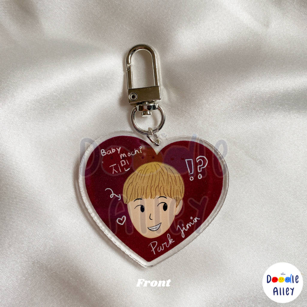 "BTS fanmade goods originally illustrated by The Doodle Alley. Variant: Jimin / Park Jimin KEYCHAIN / KEYRING DETAILS - Size 5.4 x 4.5 cm - Double sided with 2 different designs - Material: acrylic - Thickness: 3 mm