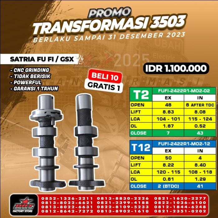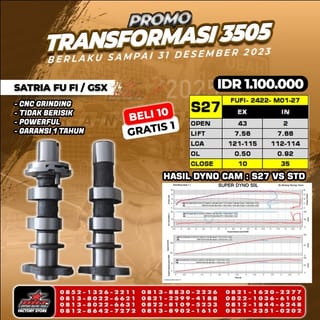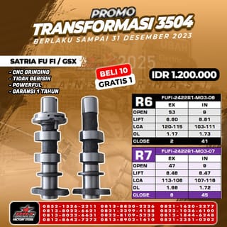 Master Cam / Noken As ORIGINAL BRT For Motorcycle : SATRIA FU FI amp; GSX 150 ( INJECTION ) PLUG amp; PLAY! Available Type : - T2 - T12 - R6 -R7 Advantages of BRT Master Cam : - CNC Grinding - No Noise - Minimal Floating at High RPM - Power up to 2HP