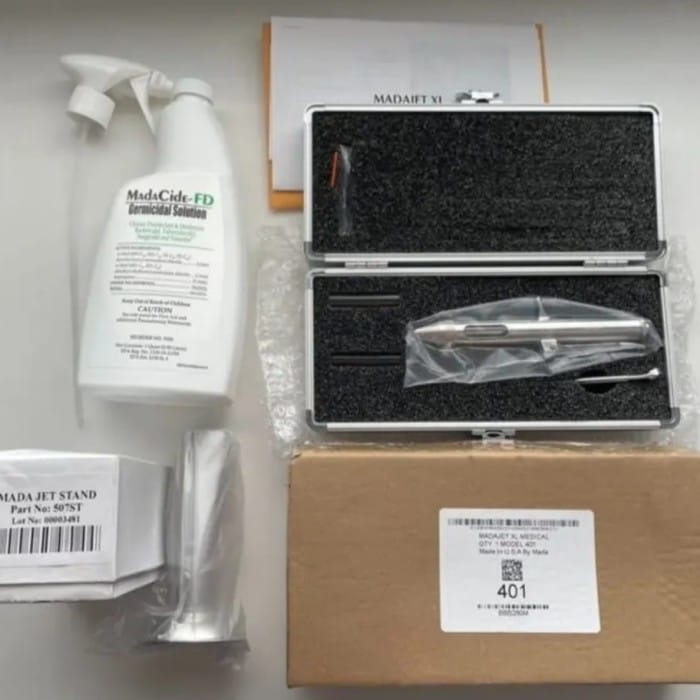 Madajet is an Anesthesia device without a syringe (Free Needle Injection) made in America (USA) original. Madajet type medical 401 & Podiatry 501 are the same specification that dispenses 0.1cc of liquid, with a distance of 5-6mm from the epithelium or noozle tip (tip) and a diameter of about 5-6mm. The sound is very smooth, the injection power is good. It is suitable for circumcision operators. Product kit madajet medical #401 & podiatry #501 contains: -1 unit of Madajet -Custom case -Stand -Stylet -Wrench Extra3/4" -Extenda Tip with cover -Extra Pyrexfil-chambers 2 pcs -MadaCide-FD disinfectant/cleaner Cheap prices, guarantee of original goods. Prices are according to USDIDR exchange rate 1$-Rp15.000 If the idr weakens at the level of Rp 15,500 and above, we will readjust. Pre-Order System with ETA (Estimation Time Arrived) in 30-41 days. We will send tokped receipts regularly. For orders of Goods from USA directly to the destination address. Can hub at ig barrakhitancenter
