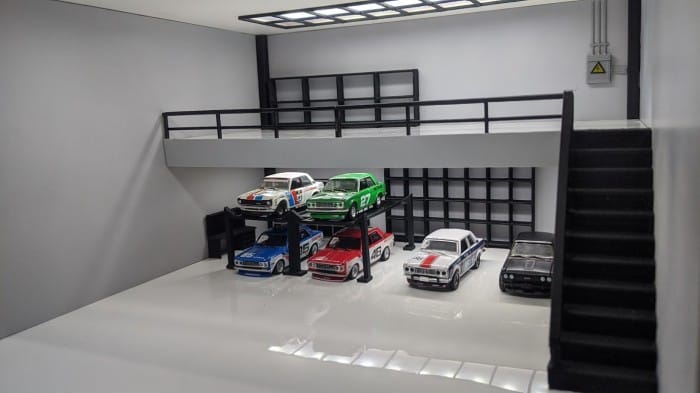 Diorama Mezzanine Clean Version Size : - D x W x H: 25 x 25 x 15 cm Ingredients : - PVC Board - 3D Printing Equipment : - Wheel Rack - Cabinet Shelves - Oil Rack - Workbench - 2 Parking Elevator - SUPER WHITE LED - Adapter