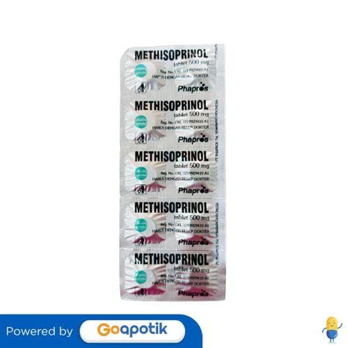 ------------------------- Description: THE USE OF THIS MEDICATION SHOULD BE AS DIRECTED BY A DOCTOR. It is an antiviral drug that works by stimulating the immune system (especially cell-mediated immune) to fight viral infections in the body. Composition: Each tablet contains 500 mg of Methisoprinol. Dosage: RULES OF USE SHOULD BE IN ACCORDANCE WITH THE DOCTOR'S INSTRUCTIONS. Children 5 years old: 50 mg/kg body weight per day and can be increased to 60 mg/kg body weight per day. Indications: Used as an antiviral that works by stimulating the immune system (especially cell-mediated immune) to fight viral infections in the body. Special Attention: Patients with gout, people with heart disease who are undergoing digitalis therapy, impaired kidney function, pregnancy and lactation. Packaging: STRIP @ 10 MEMBRANE COATED TABLETS NIE: GKL1219929410A1
