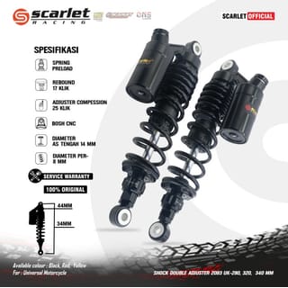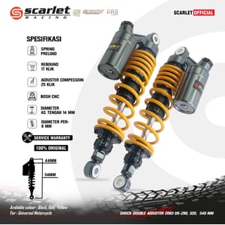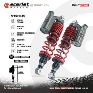 The function of the shockbreaker itself is as a shock absorber in the vehicle. Specifications: . Brand Scarlet . Size variants - 280mm - 320mm - 340mm ( measured from hole to hole) Ready Color: Black Red yellow . Comes with double settings and preload settings The meaning of the rebound setting is as a setting to quickly adjust the slow shock to the original position, while the preload is the perr/spring setting.