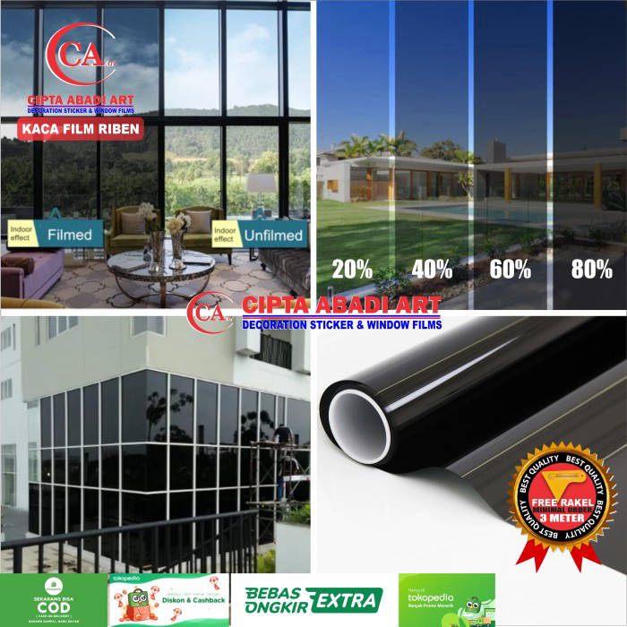**PLEASE READ TO THE END BEFORE ORDER** PROMO 1 : FREE RAKEL BUY AT LEAST 12 PCS ( 3 METERS ) PROMO 2 : CASHBACK VOUCHER + SHIPPING DISCOUNT ( With Minimum Order ) NOTE: THIS TYPE OF WINDOW FILM IS VERY PRONE TO BREAKING, ESPECIALLY OUTSIDE THE CITY SO FOR SAFETY, PLEASE ORDER A TUBE SLEEVE, THE LINK IS BELOW. NOTE : FOR RAKEL BONUSES, THERE IS NO CHARGE OF MULTIPLE PURCHASES STOCK INFO : DEFINITELY READY STOCK- CAN ORDER DIRECTLY HIGH QUALITY BLACK RIBBON WINDOW FILM IS SCRATCH-RESISTANT AND DOES NOT FADE EASILY MAIN FUNCTION - DAMPENING THE SUN'S HEAT & PRIVACY DURING THE DAY - Price is listed for sticker size 152cm wide x 50cm long Buy 1 dSend 1 roll size 152cm x 50 cm Buy 2 dsend 1 roll size 152cm x 100cm Buy 3 dsend 1 roll size 152cm x 150ccm Buy 4 dsend 1 roll size 152cm x 200 cm ( 2 Meters ) Buy 6 dsend 1 roll size 152cm x 300 cm ( 3 Meters ) FREE RAKEL Buy 10 dsend 1 roll size 152cm x 500 cm ( 5 Meters ) And so on multiples per 50 cm with a fixed material width of 152 cm INSTALLATION FROM the INSIDE During the Day = - 60%, 80% more heat and shade reduction besides not visible from the outside (Outdoor) When the Night = From the outside and inside, you can see if the light inside is brighter than outside NEW TUBE SLEEVE EXTRA PACKING; https://www.tokopedia.com/stickerkaca/selongsong-kaca-film-dan-stiker-kaca-maksimal-panjang-150-cm?whid=0 THE BEST-SELLING PRODUCTS IN OUR STORE ARE AT THE LINK BELOW, PLEASE VISIT: https://www.tokopedia.com/stickerkaca/product?sort=11 Just by pressing a button & then you have helped open the door of fortune for others. Thank you kind customer #stikerkaca #stiker #stikerkacamurah #stickerkaca #stickerkacamurah #stikcerbekasi #srickerkacamotif#stickersandblast #stickerkacatangerang #stikerkacariben #kacafilmriben #stikerkacaoneway #kacafilmoneway