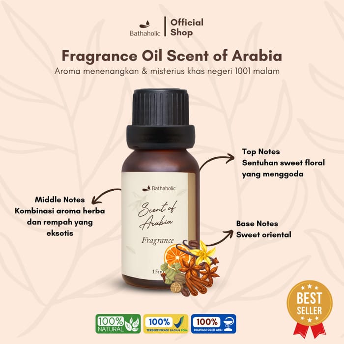 Bathaholic - Scent Of Arabia Fragrance Oil / Minyak Aromatherapy Pengharum Ruangan SPECIAL PRICE 15ml : Rp. 112,500 50ml : Rp. 270,000 The Popularity of Bathaholic Fragrance that is in Demand The popularity of Fragrance Oil continues to increase every day. Besides because of its many benefits, Fragrance Oil is in great demand by the public. Not only can it make the room proud, but Fragrance Oil can increase mood, stress and the aroma can make you relax. In fact, usually Fragrance Oil can be used for various cosmetic and beauty purposes. In addition, this type of oil can also be applied to the skin as a massage oil or treatment oil. Well, maybe for those of you who are confused about looking for Quality Fragrance Oil, Bathaholic Fragrance products can be the right choice. Aroma: - Top Notes : Luxurious sweet floral - Middle Notes : Exotic aromas of herbs and spices - Base Notes : Soft and luxurious oriental sweet How to Use: - Diffuse: Put 4-6 drops of Essential Oil / Fragrance Oil into a diffuser that has been filled with water - Dilute: Mix Essential Oil / Fragrance Oil with Carrier Oil in a ratio of 1:4 to apply to the skin What is the difference between EO/FO? - Pure essential oil (EO) 100% pure natural extraction of plants, such as flowers, leaves, bark, and roots without any mixture of synthetic/chemical ingredients - Fragrance oil (FO) Made from a mixture of synthetic chemicals. It is not pure from one type of plant, but rather a mixture to produce a stronger aroma. - Conclusion: Essential oils and fragrance oils have different roles depending on the purpose of their use. Essential oils are more suitable for therapeutic and health purposes, while fragrance oils are better for providing a pleasant scent to consumer products. Must-Read Store Policy - Orders placed before 14:00 (Monday-Saturday) will be shipped on the same day, including Instant and Same Day delivery. More than these hours will be delivered at the next operating hour. - Sundays and National Holidays the store does not serve delivery or holidays, so orders that come in on those days will be processed during the next operating hours. - Submission of a complaint or warranty claim for consumables such as oil and soap, a maximum of 1 day after the goods are received. As for non-consumable goods such as equipment containing machines such as diffusers or humidifiers, a maximum of 7 days after the goods are received (according to the date of receipt stated on the application, not when the customer opens the package). - Warranty claims can only be made if there is an UNBOXING VIDEO when the package first arrives (video starting from the outer wrap is opened until the main product is visible), if there is no then the WARRANTY is forfeited and the return application will not be accepted. - Returns will not be accepted (returned to the buyer) if the goods received are incomplete (box, goods and accessories) in accordance with the original condition, damaged due to shipping, damaged due to unsafe packaging from the buyer, for complete details please read the warranty card. - Please be wise in giving a rating, we will be very happy if there is a discussion first if there are problems with the product purchased