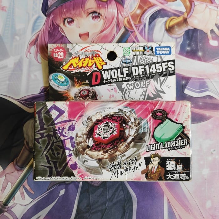 Bey Name : Dark Wolf DF145SF Type Bey : Balance Round Bey : Right spin ( right ) Bey User : Daidouji Anime : Beyblade metal fight Bey Release : March 28, 2009 Product code : BB 29 Bey brand : Takara Tomy ( original ) Bey Condition : New ( new ) Item you get - Bey Dark Wolf DF145FS - Light launcher - Dark wolf sticker - Toll Bey dark wolf this is Bey starter series where there is already a puller, so you can play directly Goods in the open just check completeness, photo of rare goods