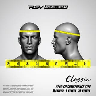 RSV CLASSIC SOLID SERIES ------------------------------------------ Certification: SNI, DoT & ECE Helmet Weight :1.1 KG Material : 100% Pure Abs Removeable Inner padding/Whole foam can be removed Wearable Glasses & Support Intercom Locking : Double D ring SIZES ONLY AVAILABLE SIZE MD-XL Unit Equipment : 1 RSV CLASSIC SOLID HELMET UNIT (CHOOSE COLOR VARIANT) Helmet Cover Helmet Drop & Manual Book Advantages of shopping at RsV Official 1. 100% Original Goods 2. Life Time Service Guarantee* 3. Warranty Guarantee Upon Shipment If the received unit is not suitable, large/small & abrasive/damaged due to delivery, immediately confirm to the admin to exchange the unit. *Video unboxing is required when the box is still sealed. *Negative reviews & no unboxing video = warranty forfeited