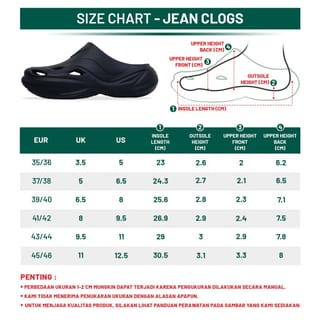 "Porto X represents a balanced lifestyle, offering style and functionality at the same time. This Porto X values innovation in comfort technology and puts forward a recovery-focused design, supporting active individuals to revitalize their feet and body every step of the way. Porto X is committed to creating footwear that supports recovery after performance, allowing customers to recover comfortably while still looking stylish. JEAN Jean Sandals – Futuristic, Comfortable, and Equipped with Recovery Technology Look different with Jean Sandals, futuristic clogs sandals that offer comfort and style. Equipped with maximum ventilation, these sandals keep your feet cool and dry all day long. Designed specifically for fat feet, Jean Sandals provide extra space without pressing on the foot, providing more comfort during activities. Recovery technology helps to recover the legs quickly, reduce fatigue, and provide additional support. Unique and stylish design, Jean Sandals are the perfect choice to stand out with maximum comfort in every step. SUITABLE FOR FOOT SHAPES: NORMAL FOOT (Medium Arch) SUITABLE FOR FOOT PROBLEMS: - MORTON'S NEUROMA: MATERIAL SOLE: FULL EVA EVA Material: Lightweight and padded sole, providing extra comfort with every step. Easy to clean, so the shoes stay looking new for longer. Stable Elasticity: Naturally adjusts the shape of the foot, providing a comfortable fit that supports free movement. Proportional Arch: Soft material support, arch insole will support every curve of the foot texture, providing a smooth massage when stepping to make the foot so comfortable AdaptiFoam: Flexible Material Technology that makes the material so soft and lightweight that it provides optimal protection. Futusitic, Stylish and Modern Design: Porto X offers a trendy look with a futuristic touch, bringing together modern style and comfort. The perfect shoe for those of you who want to stand out at every occasion! SIZE CHART: IT IS IMPORTANT TO MEASURE THE SIZE BEFORE BUYING. SEE ON THE PHOTOS WE HAVE PROVIDED ON THE PRODUCT PICTURES *IMPORTANT!!! *: - SIZE DIFFERENCES OF 1-2 CM MAY OCCUR BECAUSE MEASUREMENTS ARE TAKEN MANUALLY. - WE DO NOT ACCEPT SIZE EXCHANGES FOR ANY REASON. - TO MAINTAIN THE QUALITY OF THE PRODUCT, PLEASE REFER TO THE MAINTENANCE GUIDE ON THE PICTURES WE PROVIDE. *RETURN CONDITIONS*: - READ THE RETURN TERMS IN THE GUIDE WE HAVE PROVIDED ON THE PRODUCT IMAGE. - RETURNS CANNOT BE MADE FOR ANY REASON WITHOUT PHOTOS & VIDEOS WHILE UNBOXING WITHOUT INTERRUPTION."