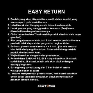 "Maverick Mid Black White Specifications: - Upper : Canvas Crafted from 10 oz Canvas material that has been specially developed and updated for Geoffmax shoes, ensuring maximum comfort and durability - OutSole : Rubber Material The outsole is made of strong rubber material, able to withstand friction in long-term wear. The manufacturing process through the Oven stage ensures strong and sturdy rubber quality, with excellent grip - Logo The shoe logo uses a material with a leather-like texture, giving the shoe a touch of luxury and an exclusive feel - Immutable Fabric Overcome color fastness issues with Immutable Fabric technology on the Canvas materials used. Makes the color on the shoe durable and does not fade easily even if used often Maverick Mid Black White is the ideal choice for those of you who want shoes with an elegant design but still prioritize quality and durability. With the best technology and materials, these shoes are ready to accompany your every step with style and confidence." Every Shoe Purchase will get a Sticker and Double Box Easy Return 1. The product to be returned is still in the same condition as when received. 2. Brand Labels and Hangtags are still intact. 3. For products that use packaging (Box), they must be returned with the packaging. 4. Claim return is valid 7 days after the product is received by the buyer. 5. If the return submission is more than 7 days after the product is received by the buyer, it cannot claim the replacement of the shipping cost. 6. Estimated normal return process < > 4 days. The estimate is calculated after the product is received by us. 7. Must be included with the unboxing video. 8. Refund (Refund) REJECT ITEMS will only be given if the stock is out of stock, if the stock is still available it will be exchanged for the same item. 9. Items that are defective for more than 7 days can be returned even if they have been used 10. In order to speed up the return process, we recommend that the buyer is required to complete the order first.